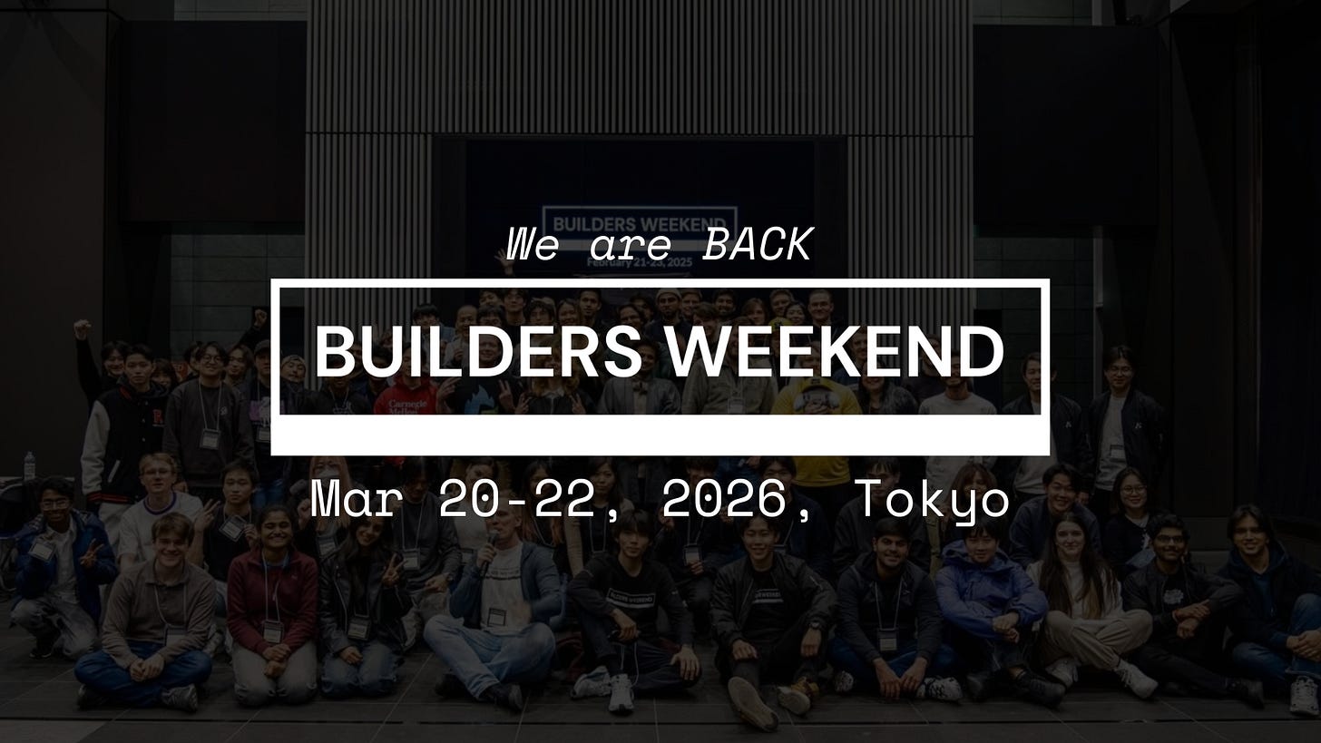 Mark your calendars for March 20–22, 2026 because Tokyo’s coolest hackathon is back! This will be our 5th Builders Weekend since we started in 2022 and we are going bigger and better. 🚀